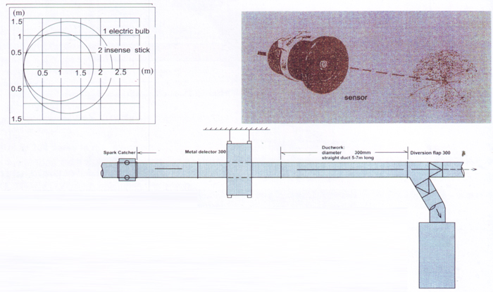 火花偵測器 金屬偵測器 火花偵測器 SR-300適用管徑:φ200-600mm偵測速度:100m/s以上感應(yīng)精度:2LU×有效區(qū)1.5M針對燃燒光譜設(shè)計有可靠性百分之百金屬偵測器 ME-350金、銀、銅、鐵、鋁、鉑……金屬物均可偵測排除。適用管徑:φ200-350mm偵測速度:50m/s以上感應(yīng)精度:φ6mm鋼球(可調(diào))
